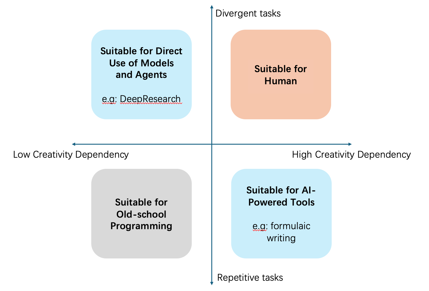 The tasks most suitable for direct use of foundation models or general purpose agents are those with low creativity dependency and relatively divergent needs (low standardization), such as DeepResearch, where the goal is clear (researching a specific topic). Even though sometimes a universal research methodology exists, the workflow remains relatively divergent and requires flexible extraction and processing of information.