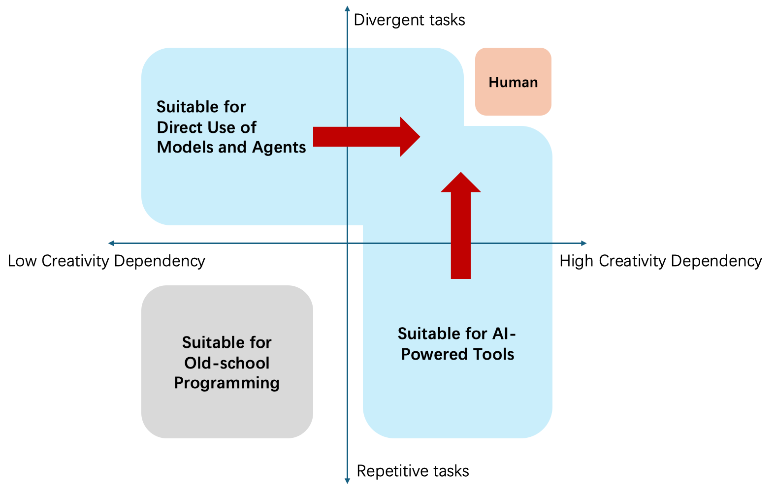 However, this coordinate system is not static. The quadrant suitable for the direct use of foundation models and the one suitable for AI-Powered tools are constantly encroaching on the quadrant suitable only for humans. In other words, more and more tasks traditionally suited for humans can now be replaced or partially replaced.